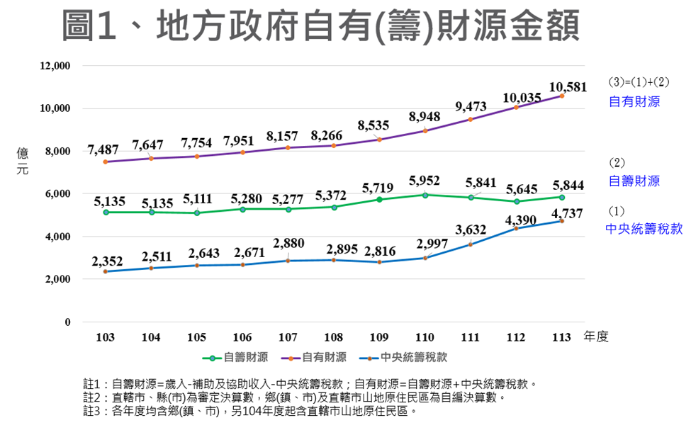 ➊自有財源明顯增加:自103年度至113年度,整體地方政府自有財源(自籌財源加計統籌稅款)逐年成長,由103年度之新臺幣(下同)7,487億元增加至113年度1兆581億元,增幅達41.3%,主要係因地方獲配之統籌稅款大幅增加,由103年度之2,352億元增加至113年度之4,737億元,增幅高達101.4%;然自籌財源則成長有限,由103年度5,135億元增加至113年度之5,844億元,增幅僅13.8%,近3年度甚較110年度減少。