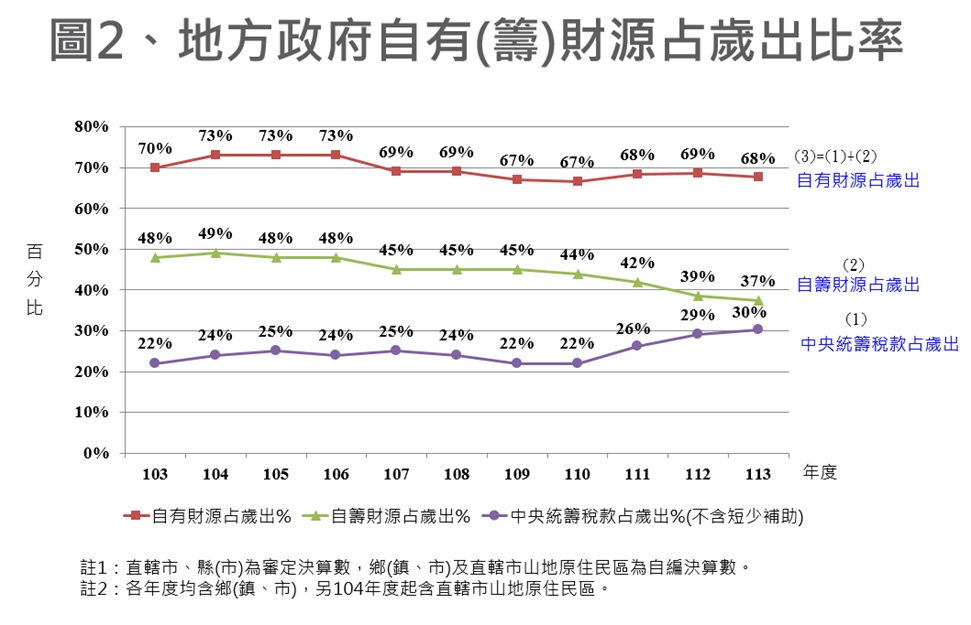 ➋自有財源占歲出比率略呈下降:近年地方自有財源雖明顯增加,惟自有財源占歲出之比率於104年度達到高峰73%後,因107年度起地方政府配合中央推動前瞻基礎建設計畫獲配補助款大幅增加,歲出規模因而大幅成長;各項來自中央之補助款對歲出挹注甚有助益,惟導致自有財源占歲出比率略有下降,近年多維持在67%至69%間。