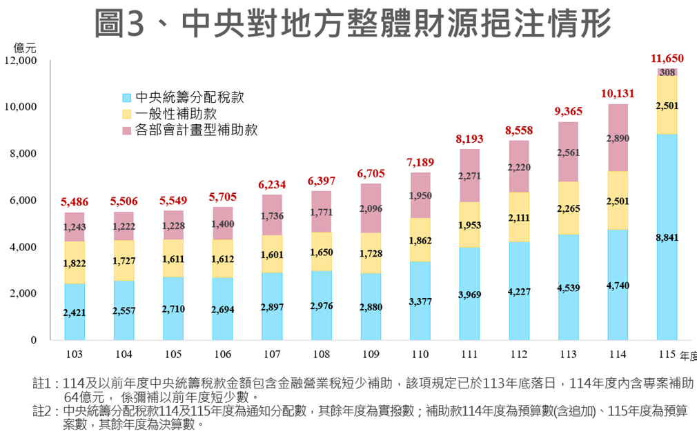➌中央對地方財源挹注成長顯著:近年中央持續透過統籌稅款,搭配一般性及計畫型補助款挹注地方財源,自103年度逐年成長至115年度,充分支應地方財政需求。