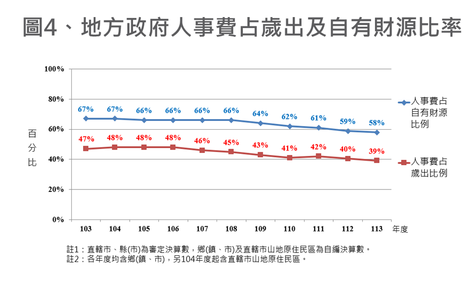 ➊人事費負擔趨緩:整體地方政府人事費占歲出比率由103年度之47%降至113年度之39%。另人事費占自有財源比率亦由103年度之67%降至113年度之58%,僵化情形已有改善。