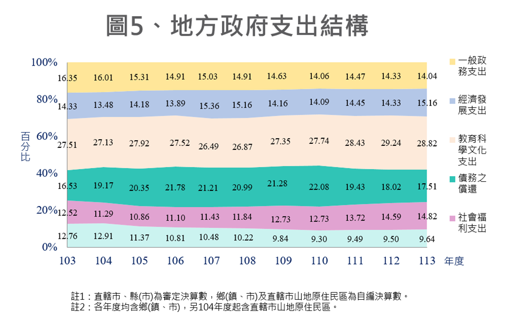➋支出結構平穩:地方政府主要支出如教育科學文化、社會福利、經濟發展及一般政務支出,支出結構尚呈平穩狀態,其中債務之償還105年度至110年度間均達2成以上,111年度至113年度逐年下降。