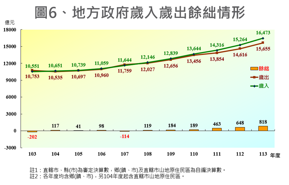 近年中央持續透過統籌稅款,搭配一般性及計畫型補助款等經常性財源挹注,地方財政已明顯改善,103年度至113年度整體地方政府歲入歲出執行情形,除103年度、107年度呈現短絀外,其餘年度均為賸餘,113年度整體賸餘更達818億元。